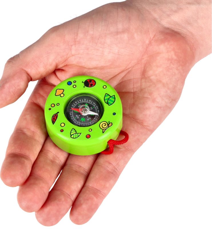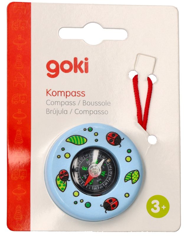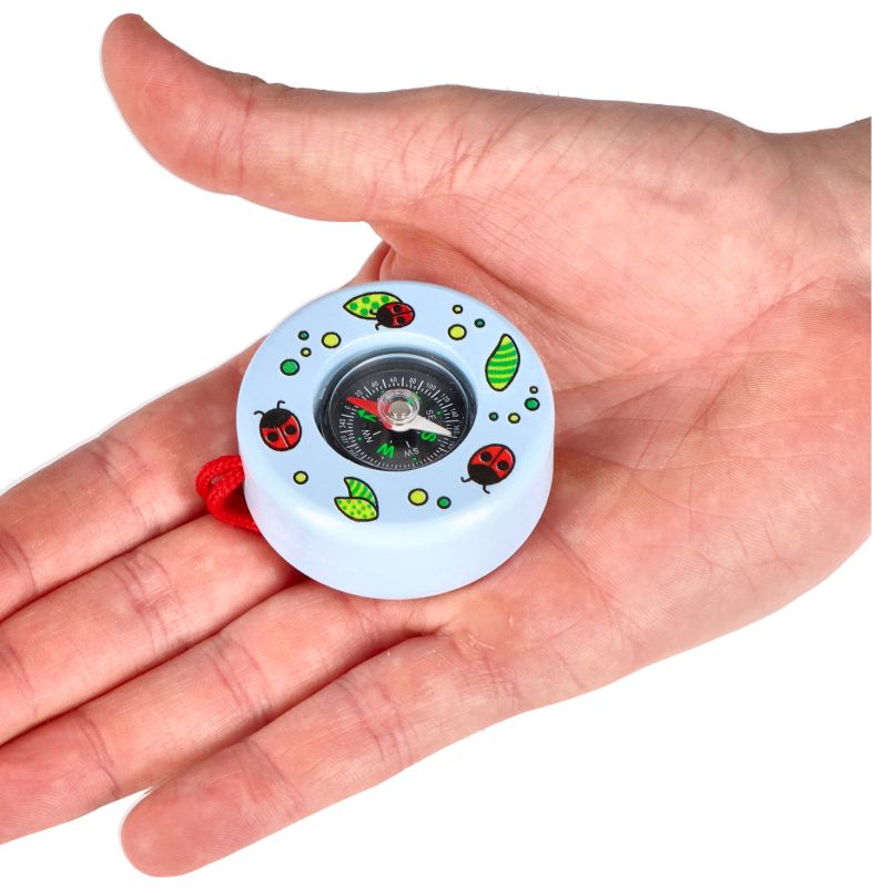 Kompas wykonany jest z drewna. Posiada igłę magnetyczną zabiezpieczoną odpornym na uderzenia szkiełkiem. Dodatkowo kompas zakończony jest pętelką ze sznurka, dzięki któremu dziecko może zawiesić zabawkę np. na rączce lub przy spodniach.