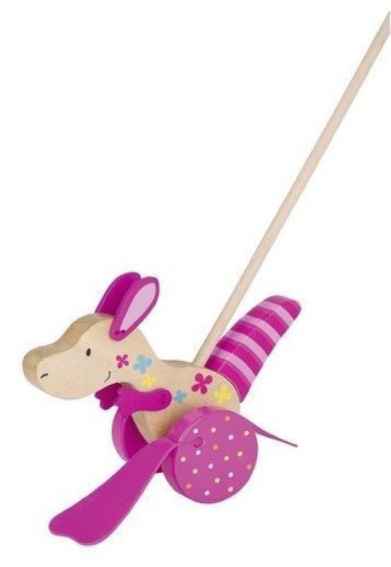Dzieci uwielbiają zabawki do pchania na kiju. Te wykonane z drewna będą służyły dziecku długo, nawet podczas długich spacerów. Kangurek ma wesołe ubarwienie w bardzo dobrej jakości wykonania. Łapki, uszy i ogon kangura można obracać.