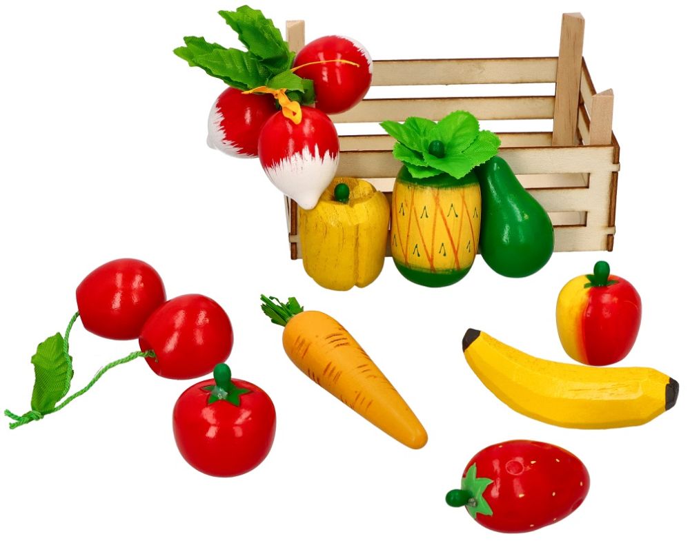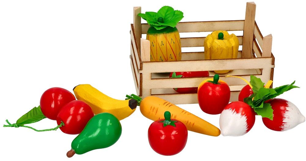 W skrzynce znajdują się między innymi: gruszka, ananas, jabłuszko,banan, papryka, rzodkiewka, pomidor. Łącznie w zestawie 10 sztuk różnych warzyw i owoców.