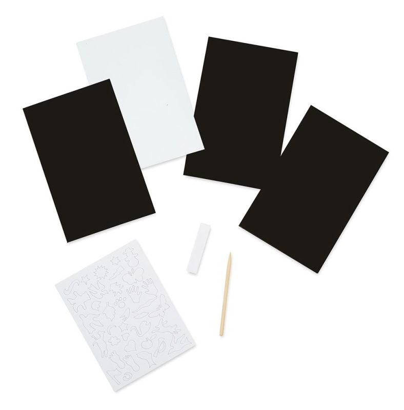 Ciekawy zestaw do zabawy plastycznej i ćwiczenia sprawności manualnej. Zabawa polega na zdrapaniu wierzchniej czarnej ( lub białej) warstwy, aby powstał ciekawy obrazek. Pod wierzchnią warstwą podkładka ma kolorowe, tęczowe lub holograficzne, błyszczące tło. Rezultat pracy nie jest do końca znany, gdyż zależy od ułożenia kolorów, kształów i od Waszej wyobraźni.