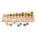 Na drewnianej podstawie rozlokowano 10 otworów i dwa rzędy kwadratów. Do otworów należy włożyć słupki od najmniejszego - do największego, a następnie należy nakładać na nie taką ilość krążków jaka jest napisana poniżej. Każdy słupek jest podpisany cyfrą, która odpowiada ilości krążków, jakie trzeba na niego nałożyć. Poniżej kwadratu z cyfrą znajduje się kwadracik z kropkami w ilości odpowiadającej cyfrze. Kropki są w pięciu kolorach, a kolory ich odpowiadają kolorom krążków. Można więc dodatkowo dopasowywać kolory do wzoru na kwadraciku. Dodatkowo kwadracik z cyferką można zdejmować z podstawy. Prosta układanka dająca dużo możliwości, a przy okazji dająca możliwość poznawania cyferek i nauki liczenia do 10.