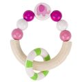 Drewniana grzechotka to idealny pomysł na prezent dla małego dziecka. Zabawka z najnowszej kolekcji Heimess zdobiona różowym słonikiem. Obręcz wykonana w połowie z drewna tak, aby dziecko mogło łatwo ją złapać, a drugą część stanowią koraliki na sznureczku. Dodatkową atrakcją jest drewniane kółeczko, które się porusza delikatnie przy tym terkocząc.