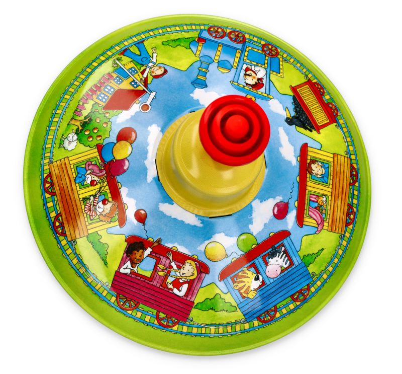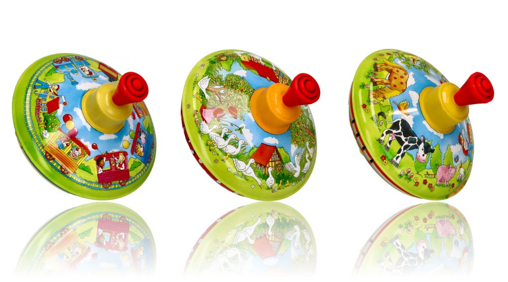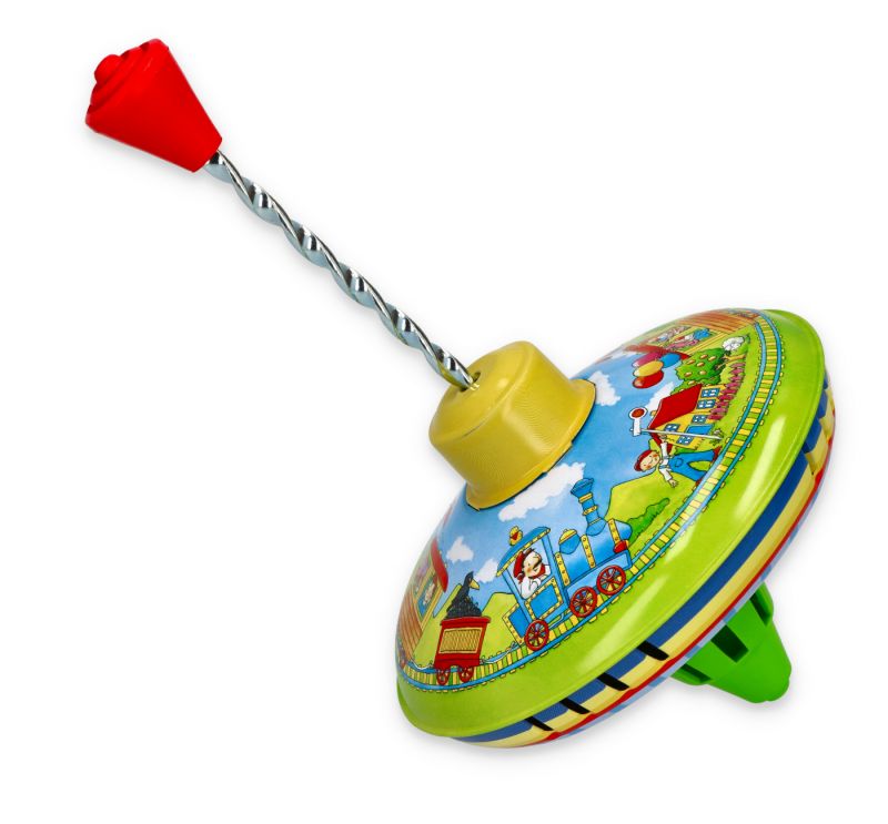 Jedna z najbardziej tradycyjnych zabawek dla malucha. Wystarczy energicznie nacisnąć kilka razy za tłoczek, aby metalowy bąk zaczął wirować, wydając przy tym charakterystyczny dźwięk.