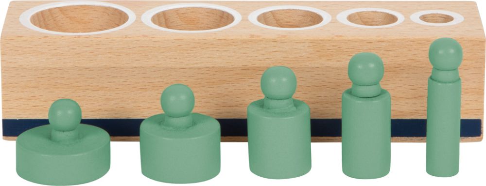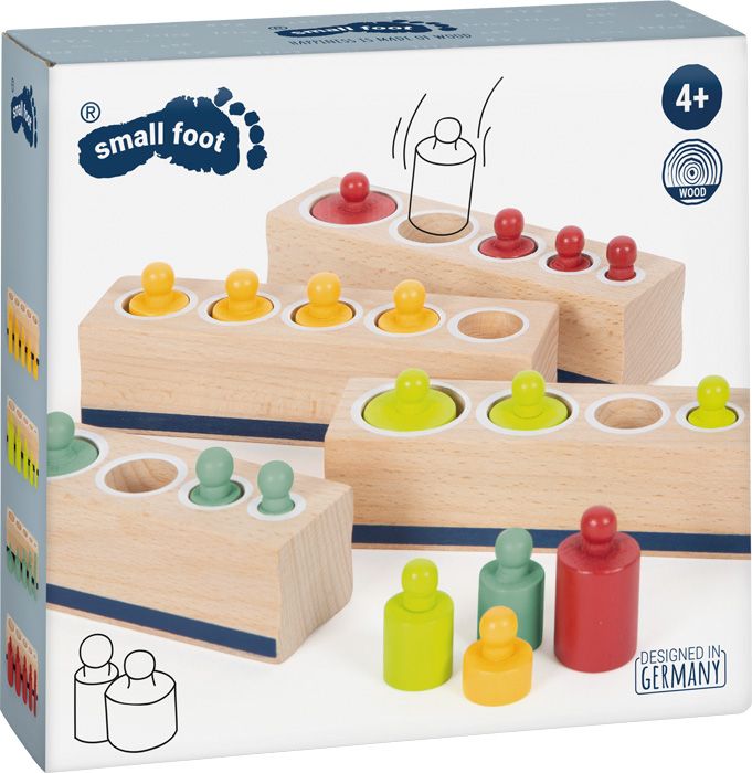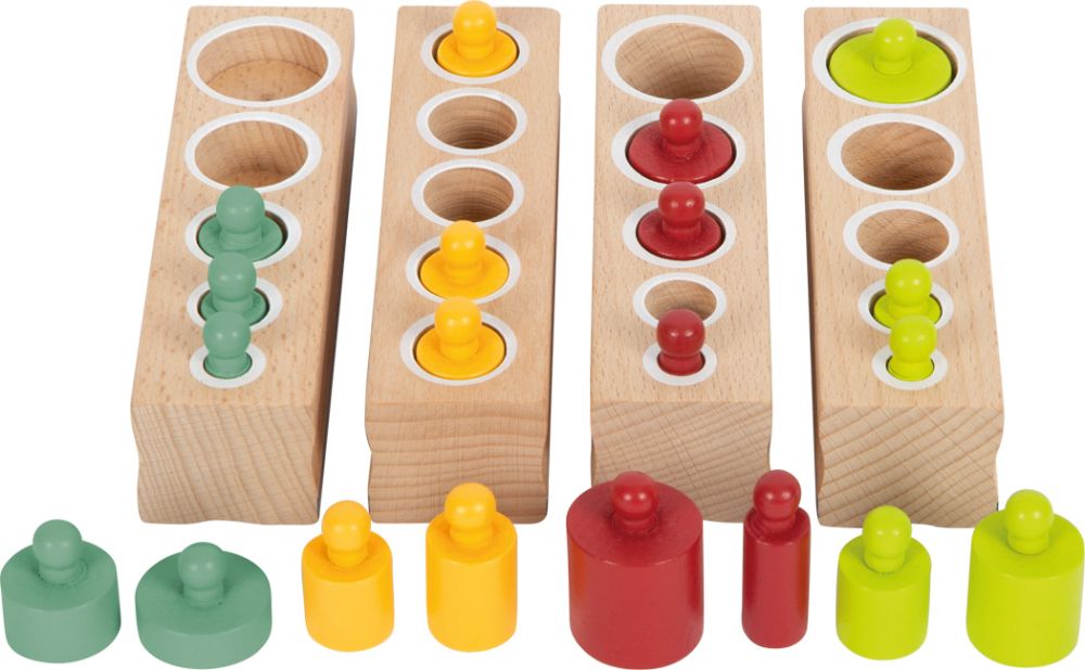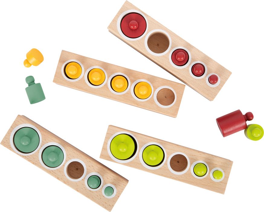 Całkiem nowa układanka to zabawka do sortowania, układania, porównywania i liczenia. W zestwie otrzymujecie cztery drewniane elementy z otworami oraz pasujące do nich odważniki. Każda podstawka zawiera pięć odważników w kolorach czerwonym, zielonym, niebieskim i żółtym. To co ciekawe to fakt, że odważniki się różnią nie tylko kolorem. Dziecko poprzez zabawę musi odkryć jakie różnice są pomiędzy nimi. Np. żółte odważniki mają jednakowe średnice, ale inną wysokość. Czerwone mają równą wysokość, ale inną średnicę itd. Dziecko samo musi wywnioskować co je różni.