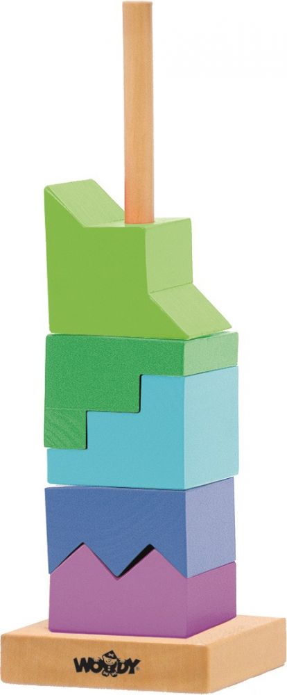 Zestaw zawiera podstawę z palikiem i 8 kolorowych klocków (każdy klocek w innym kolorze). Układanka dzięki kolorami ciekawym wyciętym wzorom zachęca do zabawy.