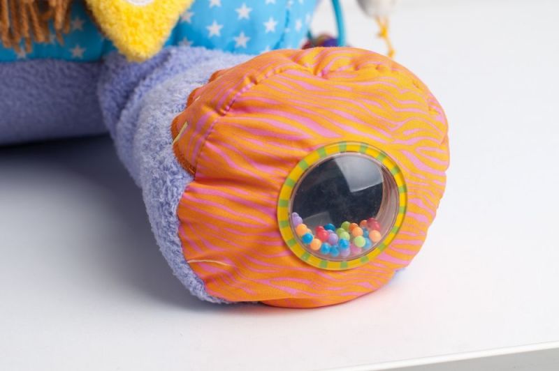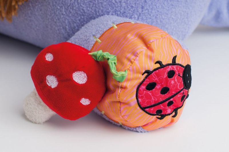- każda noga osiołka skrywa inną ciekawostkę: jedna ma wyhaftowaną biedronkę i muchomorka z grzechotką na gumce, druga to lusterko, kolejna to gryzaczek i mała kieszonka, a ostatnia to grzechoczące kuleczki zamknięte w przezroczystym elemencie z lusterkiem