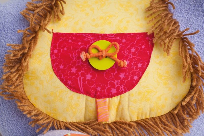 - siodło osiołka otoczone frędzelkami to z jednej strony dodatkowo ptaszek, biedronka i motylek, które są na gumce, ale mają również rzep. Można je przyczepić nim do siodła. Z drugiej strony siodło ma guziczek ze sznureczkiem przyszyty do boku oraz gryzaczek, który można wyciągnąć
