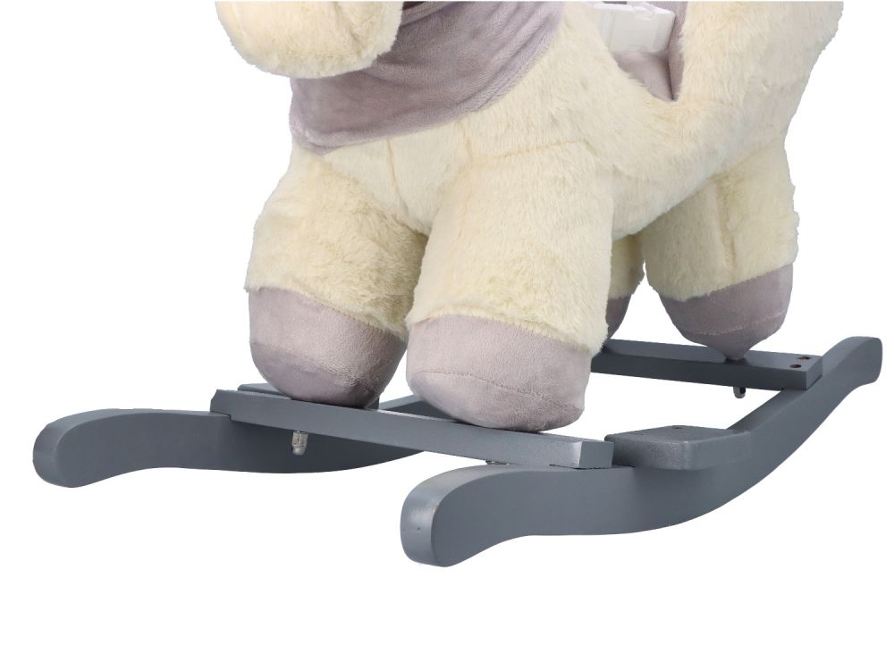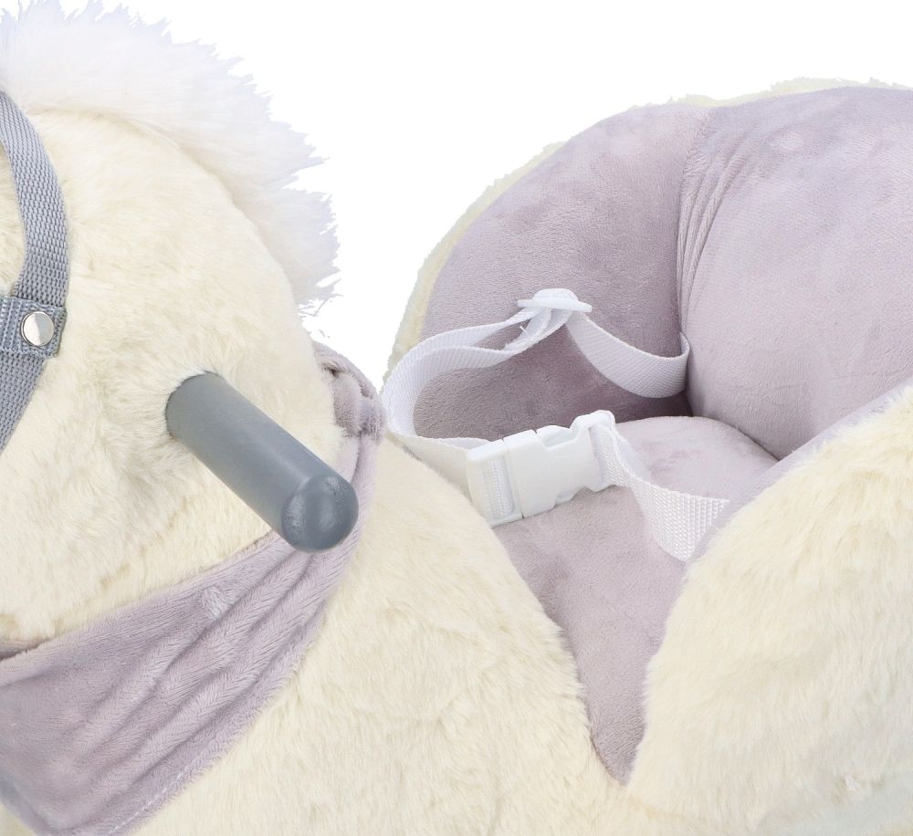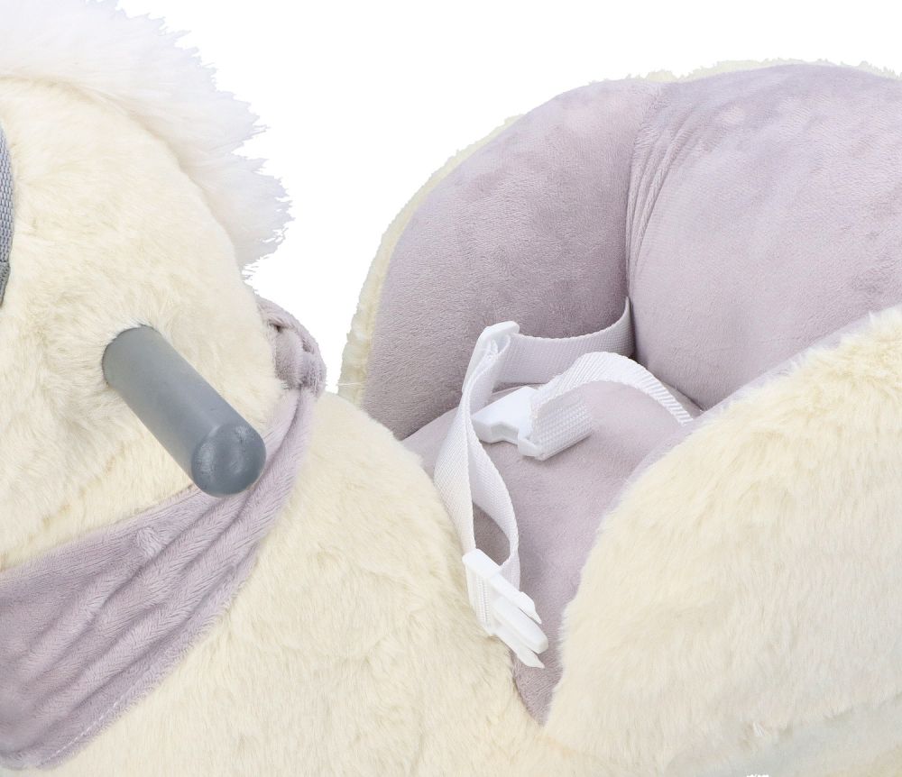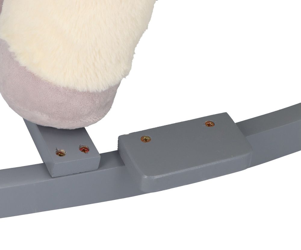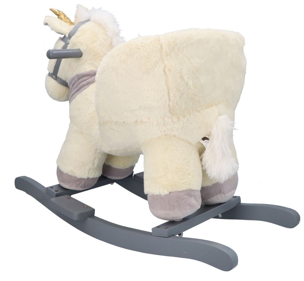 Konik wykonany jest z mięciutkiego i delikatnego w dotyku pluszowego materiału. Płozy i uchwyty na rączki wykonano z drewna. Jednorożec ma waniliowe futerko z szarymi wstawkami. Szare jest siedzisko, kopyta i chusteczka pod szyją. Konik posiada również szary kantar na głowie i oczywiście róg.
