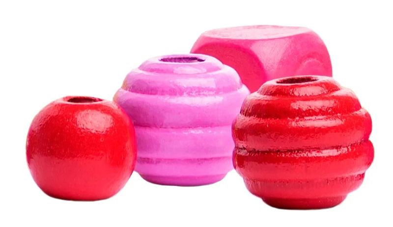 Koraliki wykonane z lakierowanego drewna w kolorach różowym, żółtym, pomarańczowym i czerwonym.