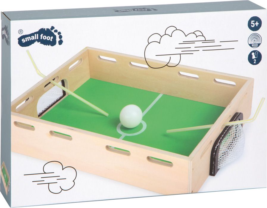 Drewniane boisko to świetna zabawa, która pomoże dzieciom w prawidłowej wymowie. Jest to gra, którą można wszędzie zabrać i grać w nią zarówno w domu jak i na świeżym powietrzu. Gra polega na dmuchaniu przez słomkę w taki sposób, aby piłeczka trafiła do bramki przeciwnika. Dzięki otworom po bokach słomkę można wkładać zarówno nad swoją bramką, jak i po bokach boiska. Dmuchajcie z całych sił, aby doprowadzić do strzelenia gola. W te grze liczy się również refleks, kto pierwszy odpowiednio ustawi swoją słomkę ten strzeli.