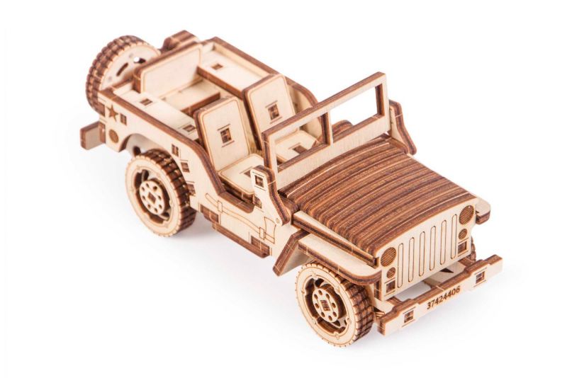 Model składa się z 72 elementów. Wspaniała drewniana układanka w bardzo ekologicznej formie. Na zdjęciu pokazano również, że jeep pasuje również do oferowanej lawety.