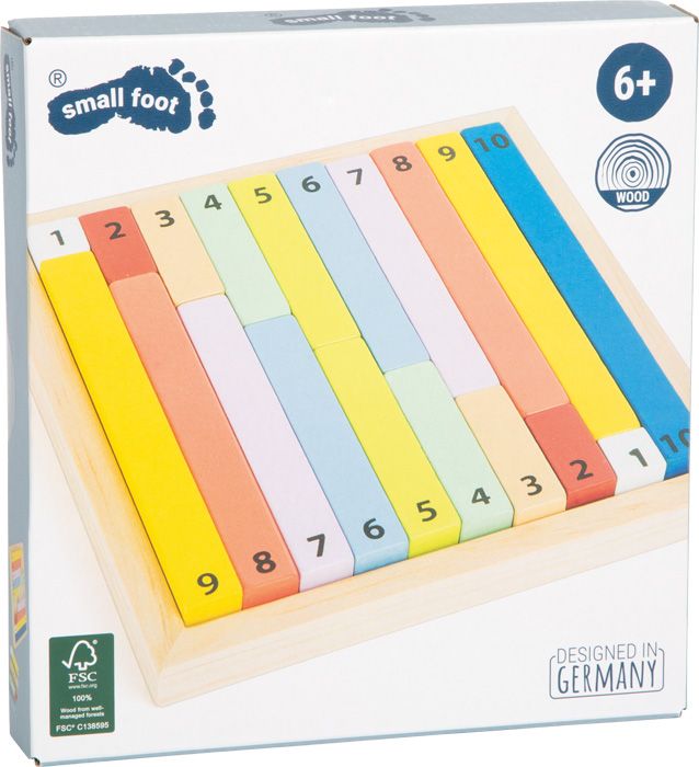 Układanka zwiera drewnianą podstawę i kolorowe klocki. Podstawa została wykonana tak, aby z każdym razem mieściły się w niej klocki, których suma równa się 10 np. klocek 1 i 9, 7 i 3, 5 i 5 itd. Dzięki temu, że każdy klocek o wyższej wartości jest większy od poprzedniego można je również układać w szeregu, aby zobrazować różnice pomiedzy liczbami i uczyć dziecko, która jest większa, która mniejsza itp. Dla jeszcze lepszej prezentacji każdy klocek ma inny kolor np. 1 - biały, 4 miętowy, 7 fioletowy...