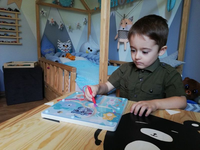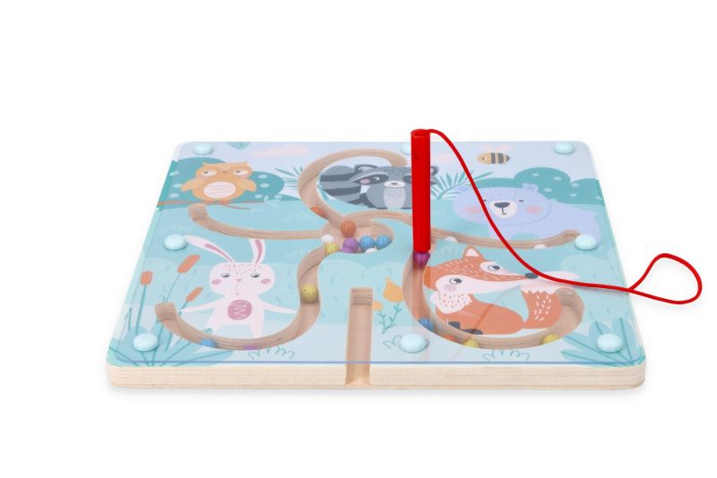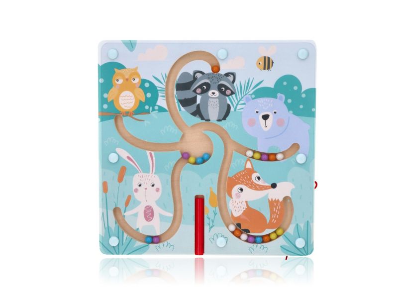Magnetyczny labirynt to drewniana plansza ze ślicznym nadrukiem leśnych zwierząt, na którą nałożono przezroczystą szybkę z tworzywa. Połączone razem nie pozwalają na wysypanie się kulek na zewnątrz. Magnetyczna pałeczka dołączona do podstawy i połączona z nią sznureczkiem ma również swoje miejsce. Jakość gwarantowana, zabawka wykonana z największą precyzją od marki Adam Toys.