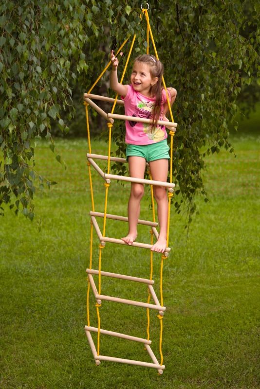 Oto sznurkowa wieża. Drabinka została wykonana na planie kwadratu tak, że dziecko może się po niej wspinać ćwicząc koordynację, ale nie tylko. Ćwiczenie sprawności, podnoszenie tężyzny i nabieranie siły jest bardzo ważne dla prawidłowego rozwoju naszych dzieci, o którym nie powinniśmy zapominać. Wspinanie się to również możliwość rozładowania energii i świetna zabawa.