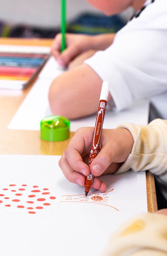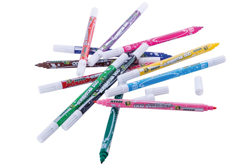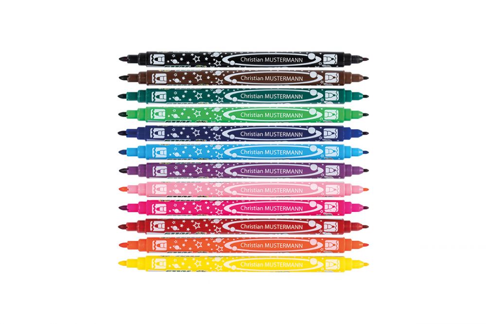 Każdy mazak jest dwustronny co daje nam jeden kolor, ale z cieńszą lub grubszą końcówką w zależności od rodzaju wykończenia jaki chcemy osiągnąć. Do bardziej precyzyjnych sprzawdzi się cienka końcówka, do zakreśleń lub pokolorowania większej części sprawdzi się grubsza.