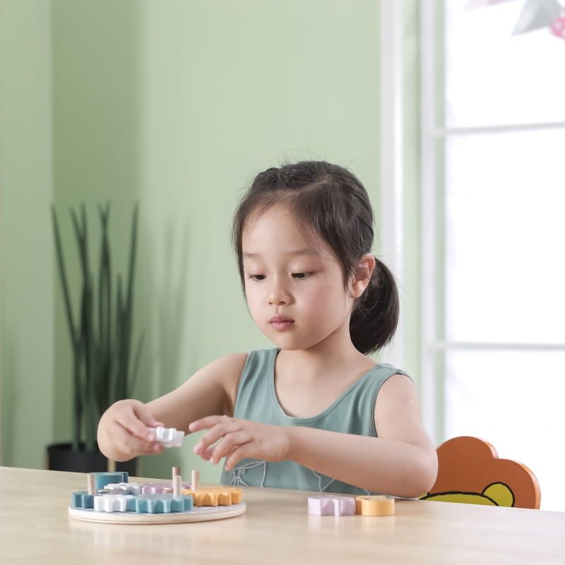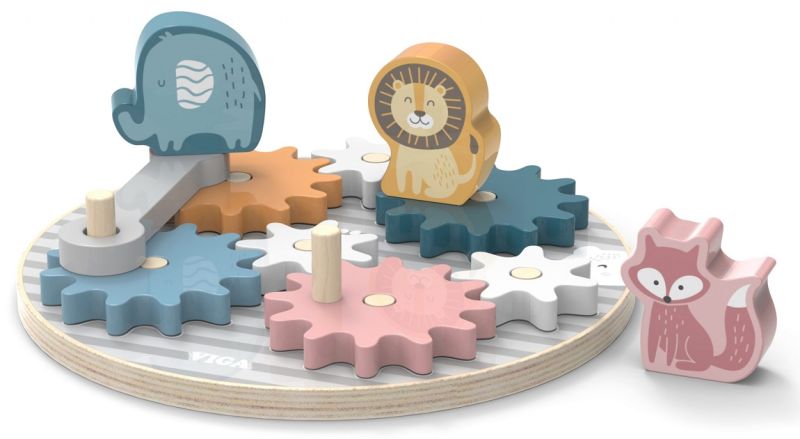 Dostępne tu 3 zwierzątka: lew, słoń oraz lisek można umieścić na poszczególnych zębatkach i wprawić w ruch. Zabawka stanowi dobrą alternatywę dla tradycyjnych puzzli czy układanek. Jest źródłem, z którego można czerpać umiejętności logicznego rozumowania i myślenia.