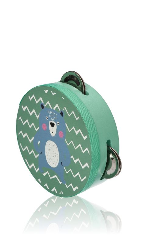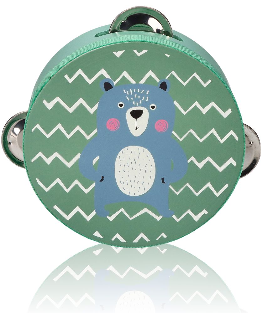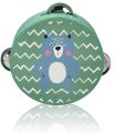 Tamburyn z trzema dzwonkami na drewnianej ramie. Śliczna miętowa kolorystyka i wesoły miś zachęcają do zabawy.