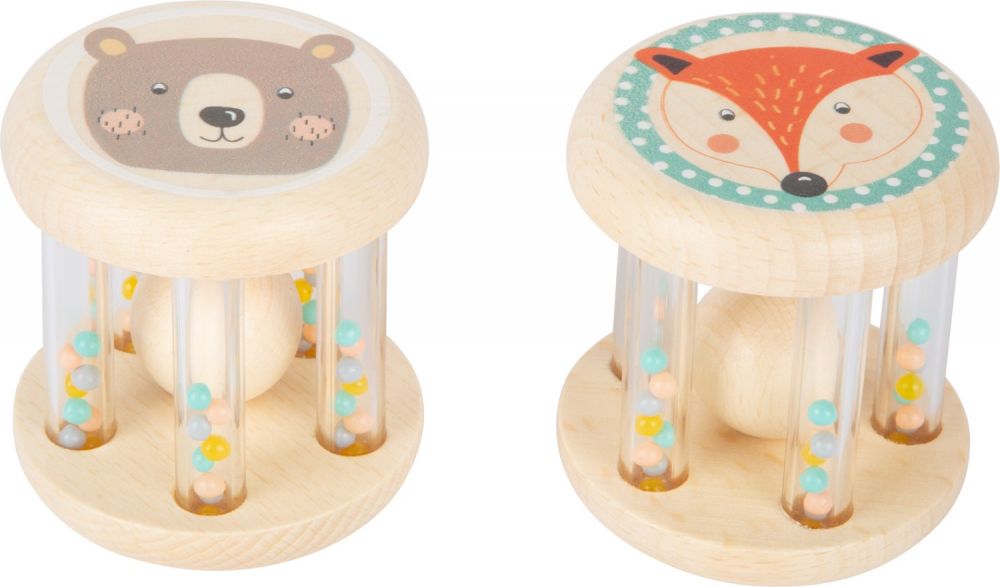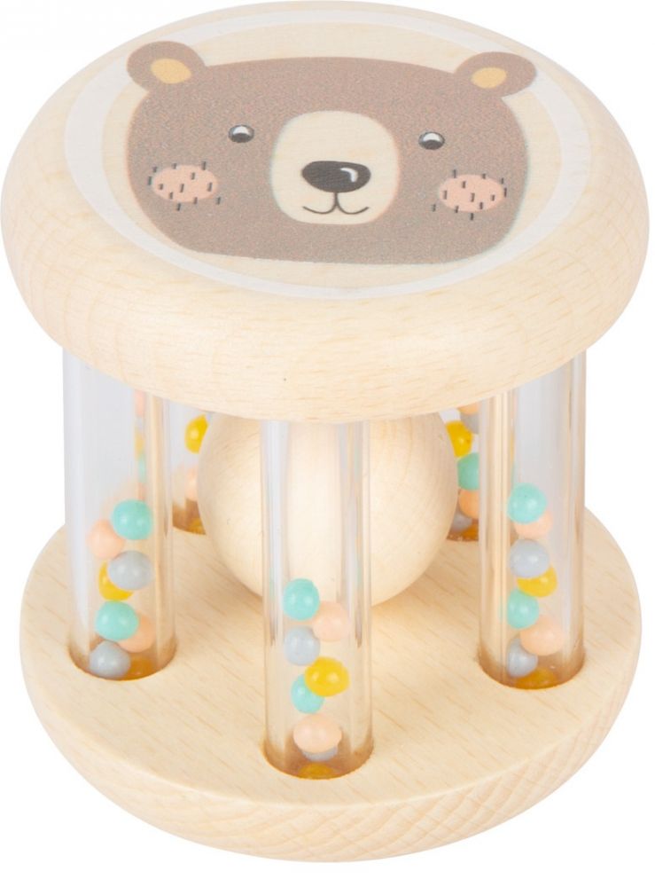 Na jednym boku mamy wizerunek wesołego Misia, z drugiej zaś beżowe gwiazdki na szarym tle z pewnością wpadną w oko waszemu brzdącowi. Drewniane boki połączone pięcioma plastikowymi, przezroczystymi rurkami, wewnątrz których znajdują się maleńkie grzechoczące koraliki w wielu kolorach. Pomiędzy rurkami umieszczona jest także drewniana kula, która obijając się raz o rureczki raz o drewniane boki wydaje charakterystyczny dźwięk uderzającego drewna.