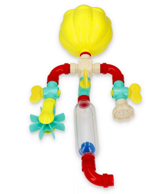 Zabawkę może obsługiwać jedno dziecko, jak również dwójka rodzeństwa podczas wspólnej kąpieli. Osoba dorosła powinna, złączyć wszystkie części zgodnie z obrazkiem na kartoniku lub według własnych preferencji. Części wystarczy wcisnąć jeden w drugi, do montażu nie są potrzebne żadne dodatkowe przyrządy. Teraz pozostaje tylko przytwierdzić główny element (żółty zbiornik na wodę) do ściany za pomocą przyssawek znajdujących się z tyłu i zabawę można zaczynać. Ustawcie kraniki w pozycji zamkniętej. Za pomocą kubeczka np. do mycia zębów napełnijcie wodą żółty zbiorniczek. Rozpoczynamy odliczanie ... 3 ... 2 ... 1 ... POSZŁO ! Do was już należy decyzja, którędy woda spłynie. Może to być słuchawka prysznicowa lub koło wodne. Przy okazji obserwujcie bacznie jak zachowuje się piłeczka w zbiorniczku. Zabawę można powtarzać bez końca.