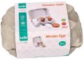 Zestaw zawiera 6 dużych drewnianych jaj zapakowanych w charakterystycznej wytłoczce. Trzy jajka są brązowe, a trzy białe.