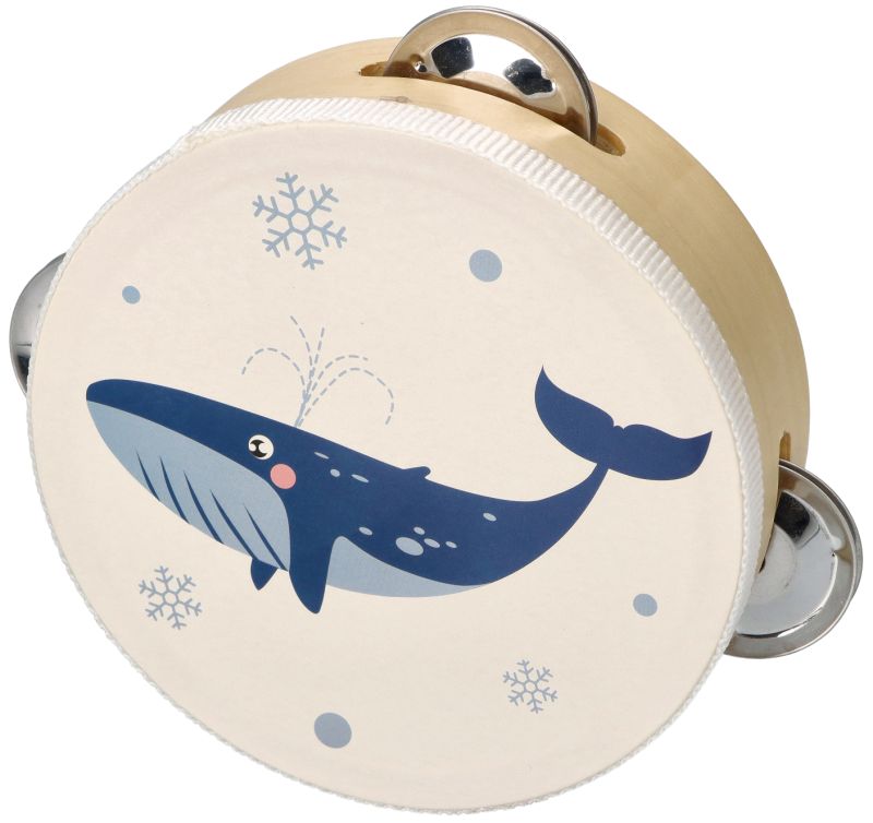 Tamburyn z trzema dzwonkami na drewnianej ramie. Biała membrana z granatowym wielorybem sprawia, że wygląda prześlicznie, a całości dopełniają śnieżynki i kropeczki.