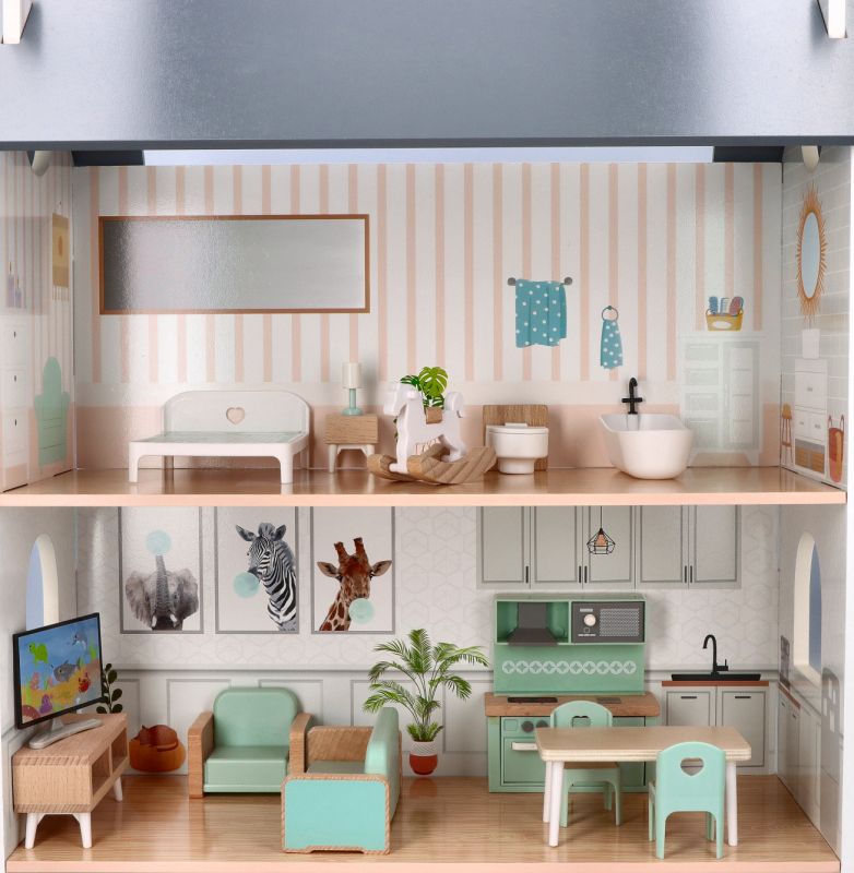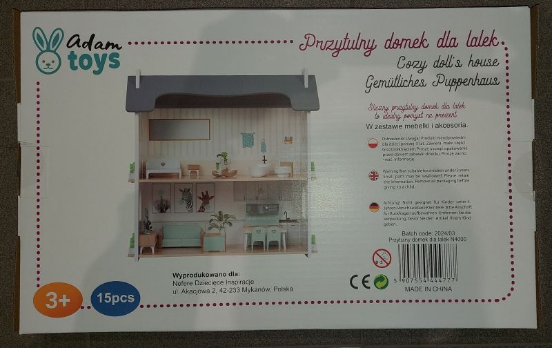 Co ważne na ścianach domku nadrukowane zostały również te elementy, których nie ma w formie mebelków tak, aby stanowiły kompletną całość. Mamy tutaj np. lustro na ścianie, ręczniki czy obrazy. Cały przód jest otwary, aby można było wygodnie się bawić.