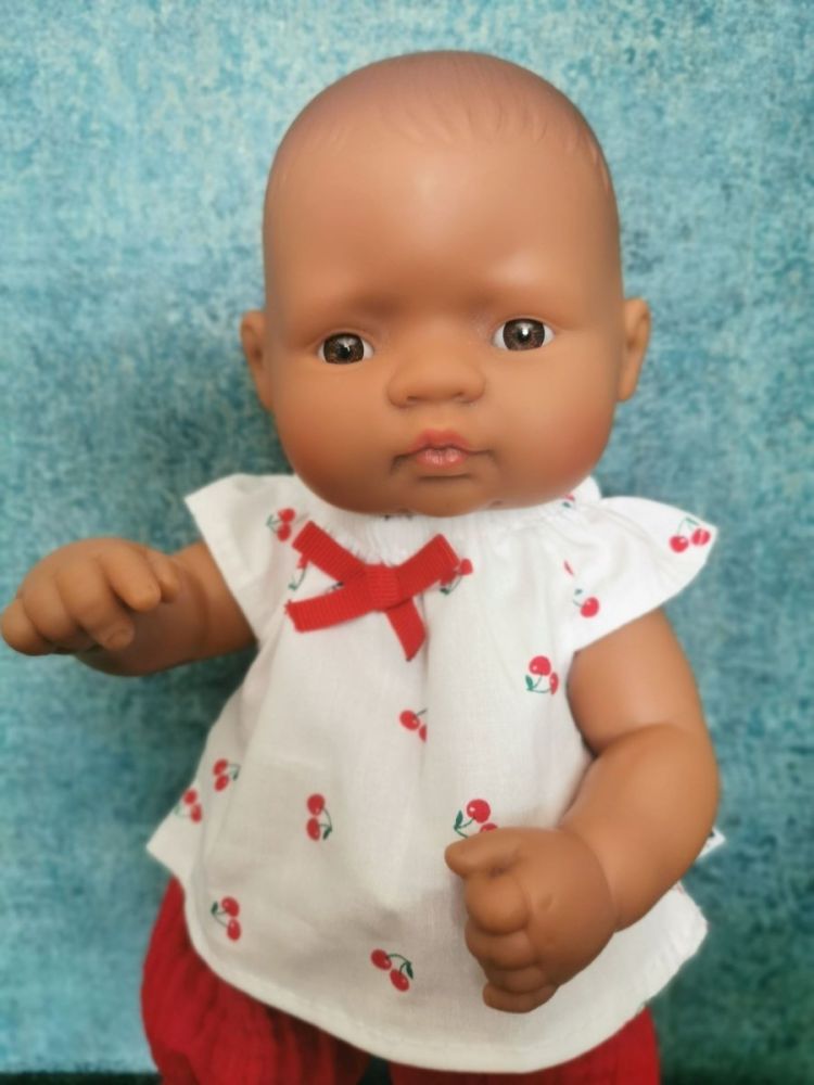 Zaprojektowana i uszyta specjalnie dla modelu lalek Miniland 32 cm. Może pasować na inne lalki o podobnych wymiarach.