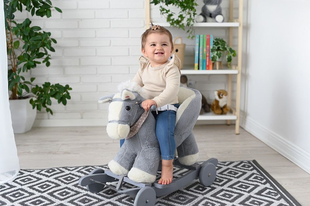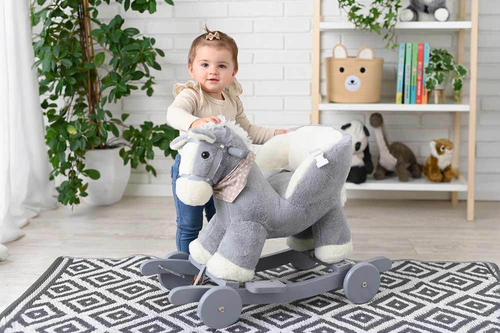 Konik wykonany jest z mięciutkiego i delikatnego w dotyku pluszowego materiału w delikatnym szarym kolorze. Płozy i uchwyty na rączki wykonano z drewna w odcieniu szarości idealnie komponują się z całością. Białe kopytka, białe wnętrze fotelika, chustka na szyi w urocze groszki, sprawiają, że trudno mu się oprzeć.