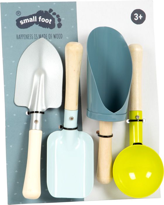 Zestaw dziecięcych narzędzi ogrodowych składający się z 4 małych łopatek oraz szpadli w różnych kształtach. Uchwyty wykonane z drewna wysokiej jakości oraz  stali nierdzewnej.