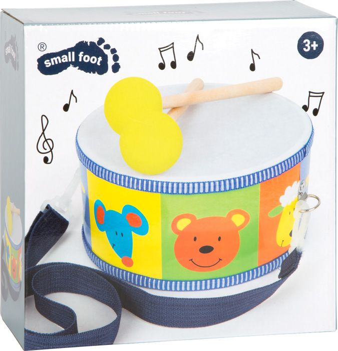 Ten kolorowy bębenek z uroczymi głowami zwierząt zaprasza do radosnych zabaw w pokoju dziecięcym! Dzięki pałeczkom perkusyjnym i ich piankowym osłonom bęben może wytwarzać szeroką gamę dźwięków. W zestawie regulowany pasek do noszenia z dwoma karabińczykami i dwoma pałeczkami perkusyjnymi z piankową osłoną. Tutaj dzieci mogą trenować swoje zdolności motoryczne, wyszaleć się i odkryć swoje zainteresowanie muzyką!