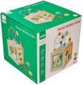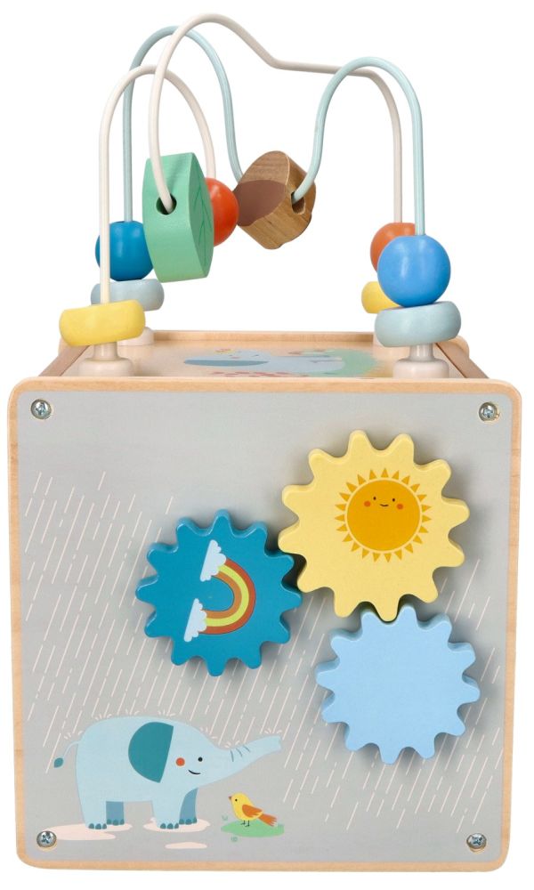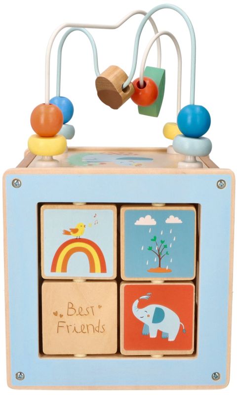 Całość tworzy kolorową zabawkę do trenowania wielu ważnych umiejętności. Górną część można podnieść, aby wyciągnąć klocki ze środka. Po jej odwróceniu zabawka nie zajmuje dużo miejsca.