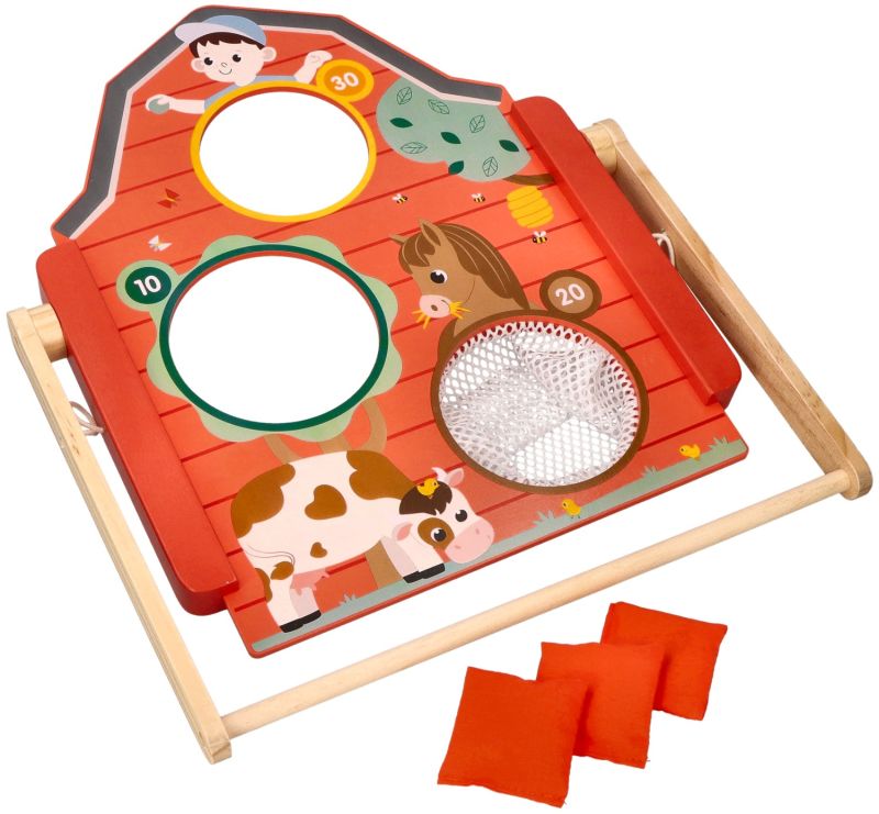 Zabawy ruchowo-zręcznościowe to super rozwiązanie zachęcające dzieci do aktywności ruchowej. Dzięki zachęcaniu dzieci do gry i ruchu, sprawiamy, że zdrowo się rozwijają a także pracują nad sprawnością ruchową. Niewątpliwą zaletą tej gry jest to, że sprawdzi się zarówno w domu, jak i na dworze. Tablica wykonana z drewna z motywem zwierząt z farmy z pewnością przypadnie do gustu dzieciakom i zachęci do celnych rzutów.