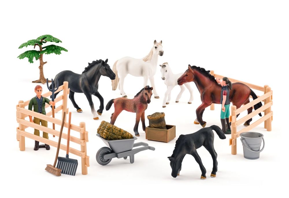 Ten bogato wyposażony zestaw pozwoli na tworzenie wielu ciekawych oraz zajmujących historii z ich udziałem :) Tworzenie i odgrywanie scenek z motywem Koni na farmie rozbudza wyobraźnię i rozwija tym samym kreatywność. Figurki są wspaniałym narzędziem edukacyjnym, wykorzystywanym podczas zajęć i zabaw Montessori, ucząc dzieci o przyrodzie, zwierzętach i otaczającym nas świecie. Wszyscy miłośnicy koni z pewnością rozpoznają zarówno maści koni jaki i odmiany np. biała skarpetka. Dodatkowo znajdą tu nie tylko figurki zwierząt ale i wszystkie akcesoria, które dodają realizmu. Wszyscy konierze wiedzą przecież, że tam gdzie są konie muszą być i narzędzia typu widły czy taczka. Musi być zarówno pasza, jak i ogrodzenie, bo dbanie o takie zwierzęta, jak konie to nie tylko jazda czy czyszczenie koni, ale również dbanie o całe ich otoczenie.