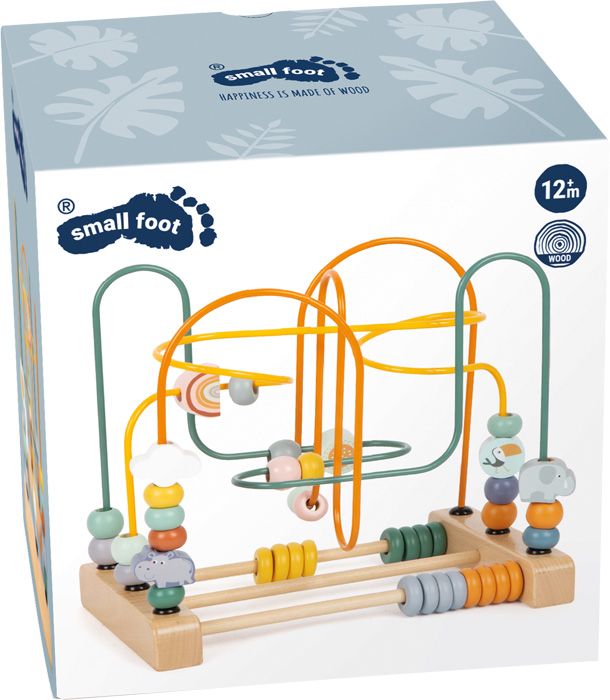 Na trzech metalowych kolorowych prętach (żółtym, pomarańczowym i zielonym) znajdują się drewniane koraliki, którymi dziecko może przesuwać w dowolny sposób, ćwicząc przy tym precyzję ruchów palców i dłoni. Na pętlach znajdują się ponadto 3 klocki z wizerunkami zwierząt z safari: tukanem, słonikiem oraz hipopotamiem. Przy podstawie przeplatanki znajduja się 2 szyny z kolorowymi przesuwnymi koralikami do nauki liczenia.