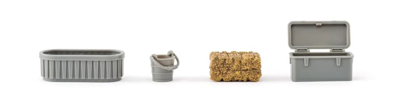 - akcesoria do zagrody (poidło, wiadro, bela słomy, paśnik, skrzynia na szczotki)