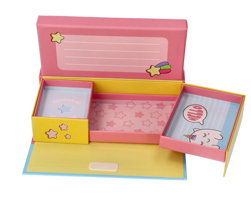 - dolna część dzieli pudełko na 2 mniejsze przegrody oraz jedną podłużną szufladkę, do której dostęp będziecie mieli dopiero po rozsunięciu jednej z przegródek do boku