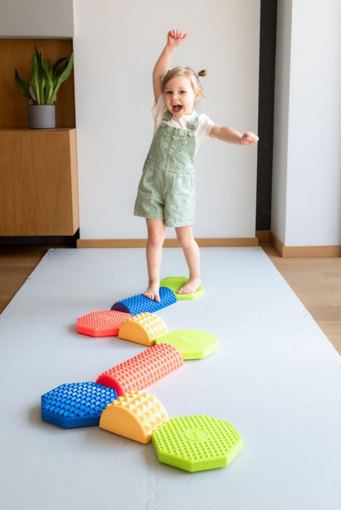 Elementy można łączyć w dowolnej konfiguracji – tworząc tor przeszkód lub ścieżkę dopasowaną do wieku i potrzeb dziecka. Idealna do użytku w domu, przedszkolu czy gabinecie terapeutycznym.