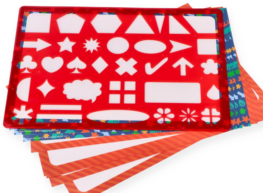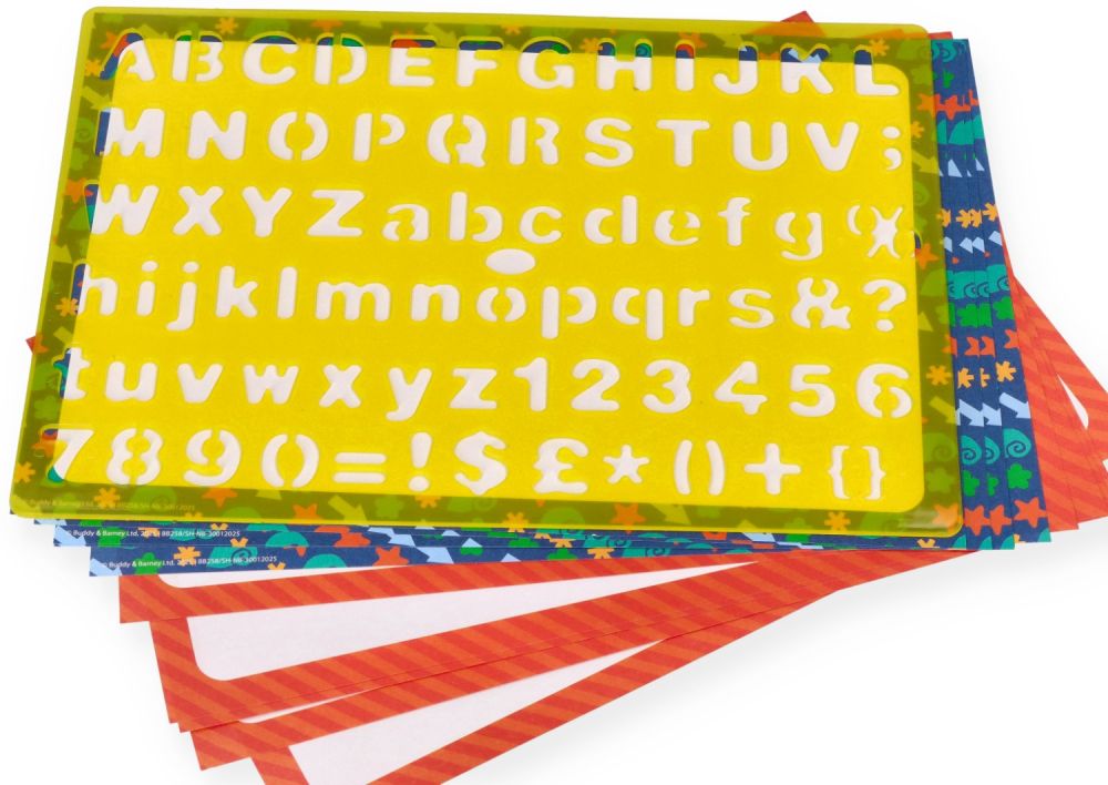 - 2 szablony wielokrotnego użytku. Na jednym szablonie znajdziecie alfabet mały i duży, cyferki oraz znaki. Drugi szablon to kształty zarówno te podstawowe figur geometrycznych, ale i te mniej oczywiste jak strzałka, kolory figur karcianych czy kwiatki
