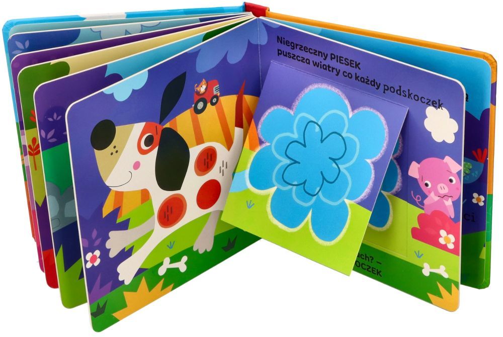 - okienka - na pierwszej stronie mamy otwarte okienko, a na kolejnych okienka do otwierania, co zachęca dziecko zaróno do aktywności, jak i przeglądania tej książeczki