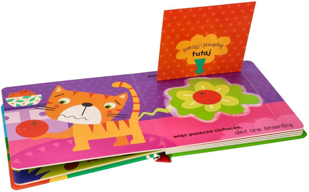 Książeczka składa się z 6 grubych stron z zabawną historią o zwierzętach z farmy oraz pachnącymi, otwieranymi okienkami.