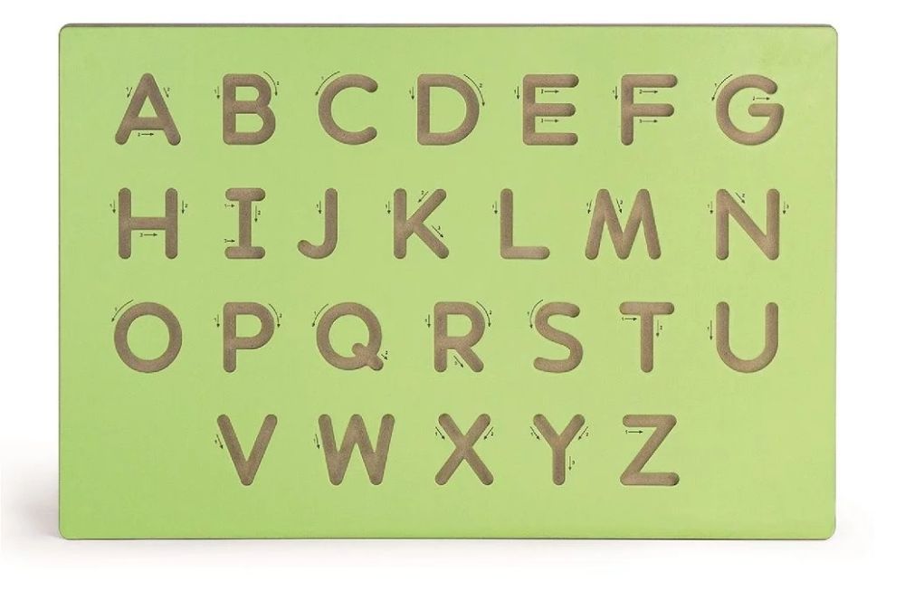 W tym przypadku proponujemy panel wymienny alfabet z dużymi literami. Dzięki takiej zabawce dziecko uczy się zarówno kształtu poszczególnych liter, ich kolejności oraz ich pisania. Dzięki temu, że litery na panelu są dość duże (wysokość 5,5cm) dziecku wygodnie ćwiczyć ich pisanie. Dodatkowo przy każdej literce umieszczono strzałki i cyferki pokazujące dziecku jak zacząć pisać daną literę i jaki krok powinien być następny, jeśli to konieczne. Np. literę "A" wykonujemy w trzech krokach, a "O" tylko w jednym.