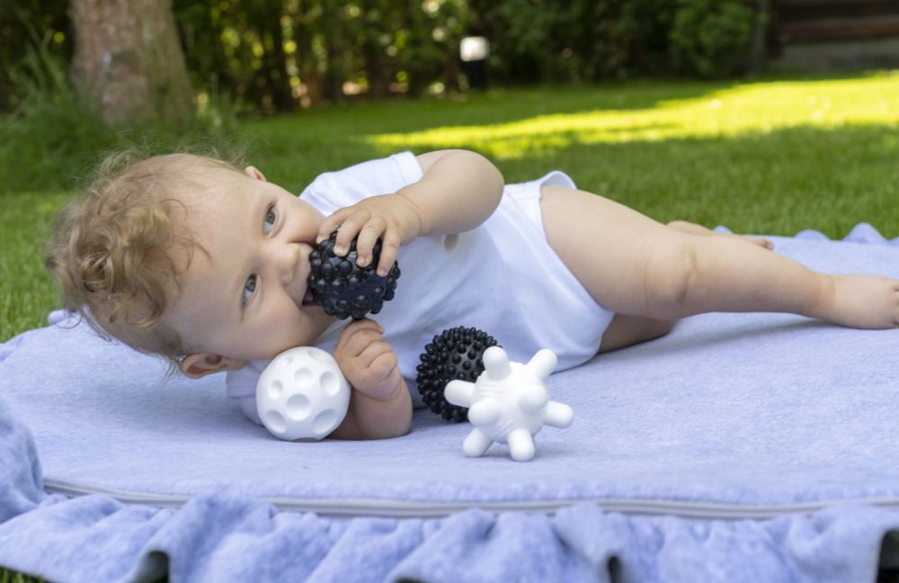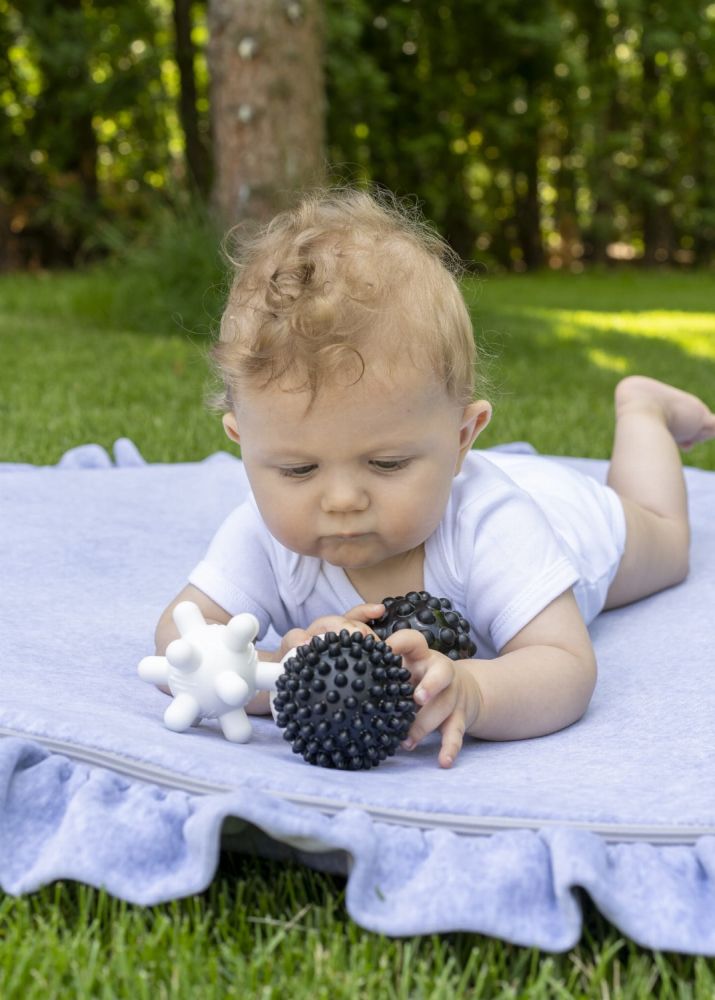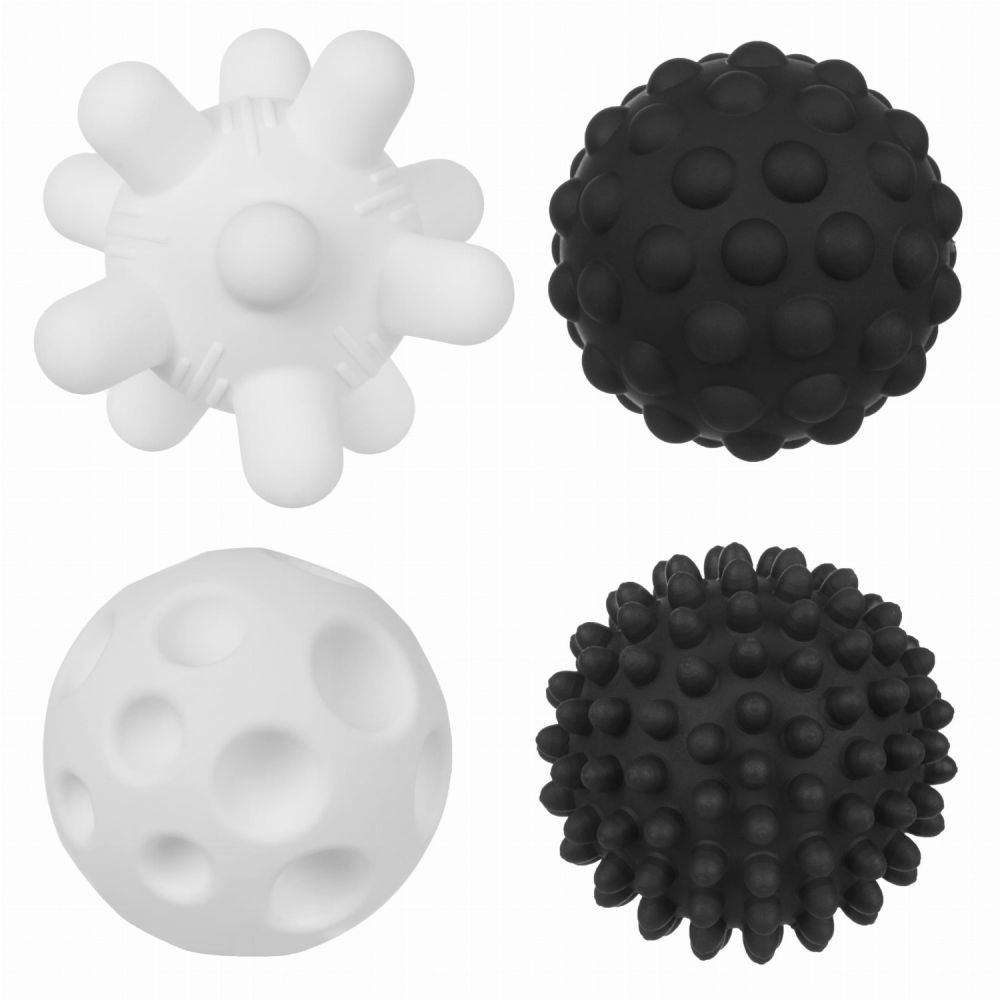 Zestaw zawiera 4 piłeczki: białą z podłużnymi wypustkami, czarną z małymi wypustkami, czarną z większymi wypustkami oraz białą z wklęsłymi kółeczkami.