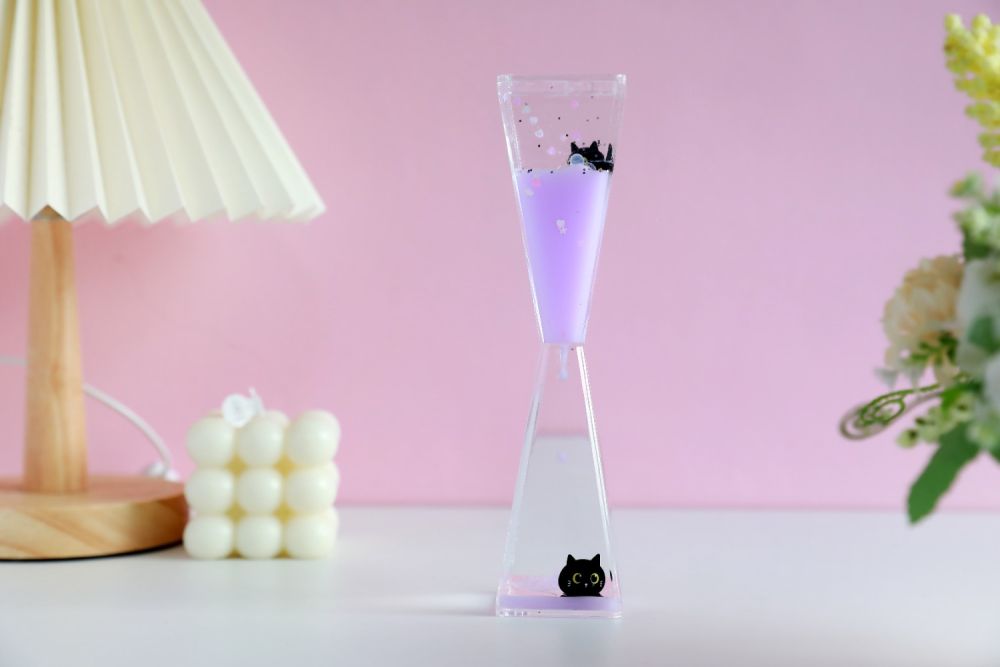 Ta wyjątkowa klepsydra to połączenie uroczego designu i hipnotyzującego efektu wizualnego. W jej wnętrzu delikatnie spływa błyszczący strumień żelowego płynu z mieniącymi się kawałkami brokatu, tworząc trójwymiarową, mieniącą się kompozycję, która przyciąga wzrok i wprowadza w stan relaksu. Motyw czarnego kotka dodaje jej niepowtarzalnego, słodkiego charakteru – idealnego dla miłośników estetycznych dodatków i magicznego klimatu. Obserwowanie powoli opadającego brokatu działa kojąco na zmysły, pomaga się wyciszyć i oderwać od codziennego stresu.