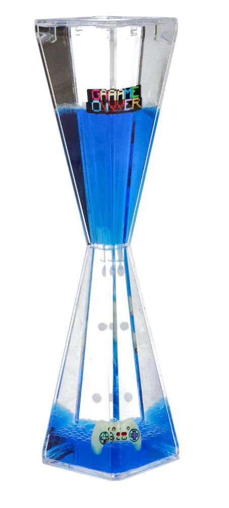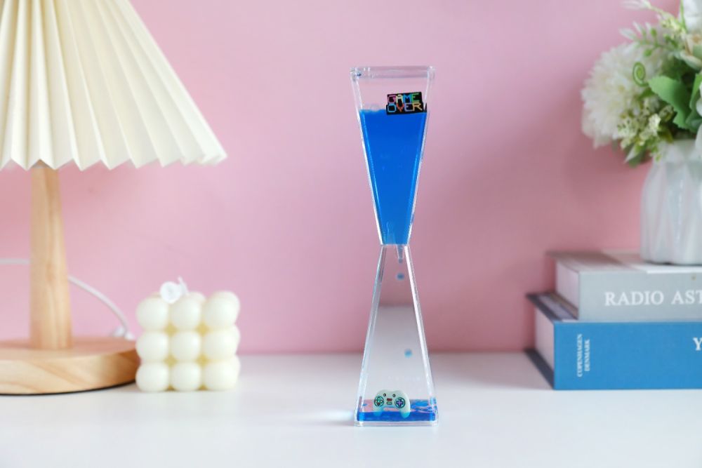 Ta wyjątkowa klepsydra to połączenie zjawiskowego designu i hipnotyzującego efektu wizualnego. W jej wnętrzu delikatnie spływa strumień żelowego płynu z zatopionymi elementami, tworząc ciekawą kompozycję, która przyciąga wzrok i wprowadza w stan relaksu. Motyw pada do gier dodaje jej niepowtarzalnego charakteru – idealnego dla miłośników estetycznych dodatków i magicznego klimatu. Obserwowanie powoli opadającego żelowego płynu działa kojąco na zmysły, pomaga się wyciszyć i oderwać od codziennego stresu.