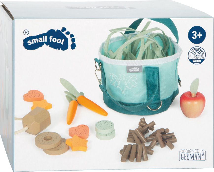 W zestawie znajdziesz m.in. filcowe siano, granulki, jabłko, marchewkę, lizawkę oraz drewniane smakołyki – wszystko dopasowane wielkością do dziecięcych rączek, by zabawa była wygodna i naturalna. To doskonały sposób na rozwijanie wyobraźni, empatii oraz kreatywnego opowiadania historii podczas zabawy.