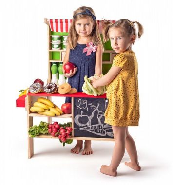 Zabawa „w sklep” to niezmiennie jedna z najpopularniejszych dziecięcych zabaw. Aby pobudzić wyobraźnię dziecka w trakcie tej zabawy przygotowaliśmy piękne i kolorowe zestawy i akcesoria do tej zabawy. Drewniany stragan, drewniane warzywa i owoce, pieczywo, ciastka, kasa fiskalna i różne rodzaje wag umożliwiają stworzenie różnych wariantów zabawy: w piekarnię, warzywniak, cukiernię itd.