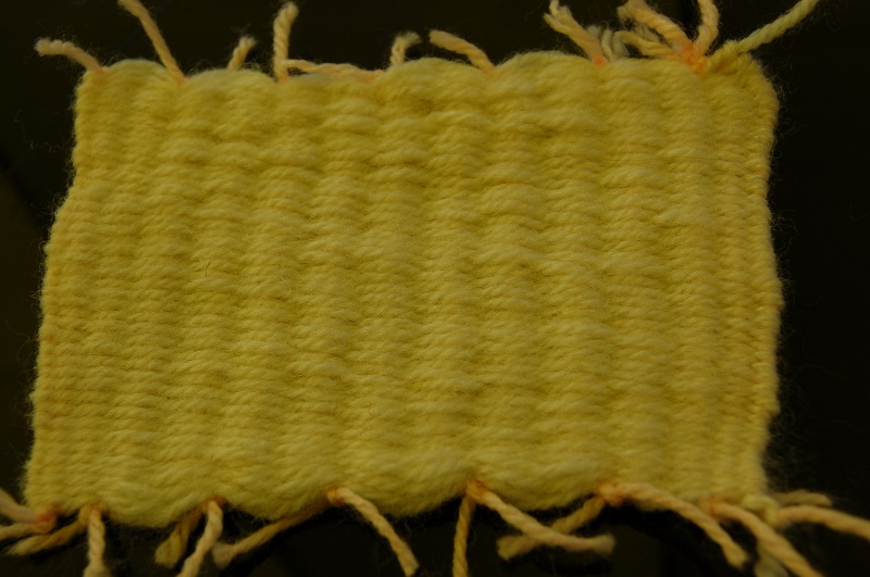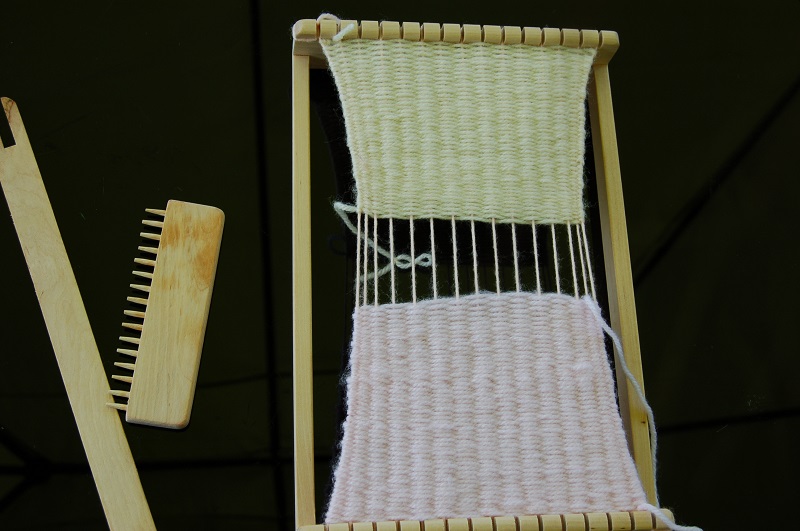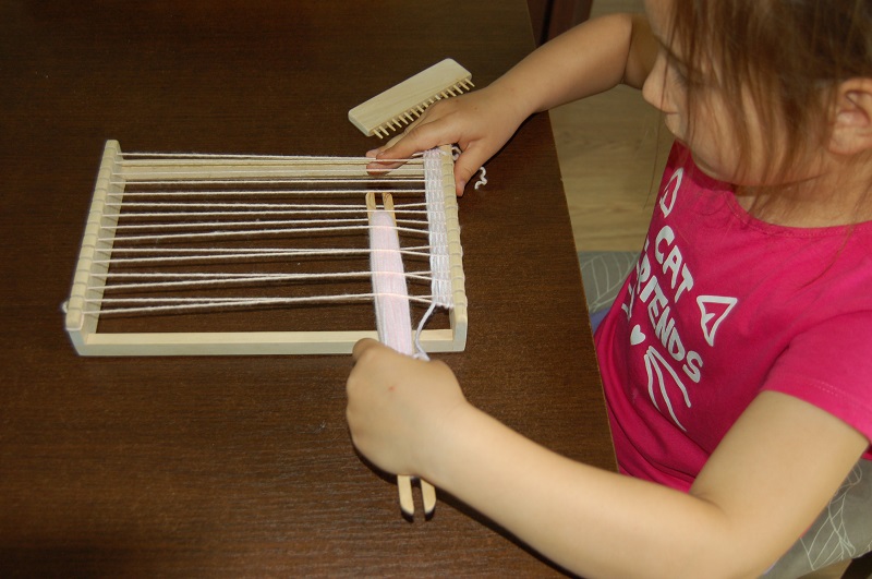 Następnie należy utkać kawałki materiału. My utkaliśmy trzy mniejsze. Można też utkać jeden większy i mniejszy na klapkę. Klapkę zrobiłyśmy w innym kolorze. Tkanie jest najdłużej trwającą czynnością, ale bardzo przyjemną. Nasza rada to zostawić odstęp na początku i końcu tkanego kawałka, aby łatwiej było zawiązać sznureczki na zakończenie tkania.