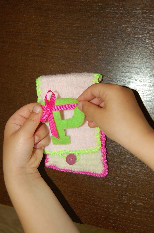 Do literki przyszyta została wstążeczka i można było przystąpić do przyklejenia literki. Jeśli klejenie okazałoby się nieskuteczne można też literkę przyszyć. Oczywiście ozdobić można je na wiele sposobów. Można użyć koralików, cekinów itp.