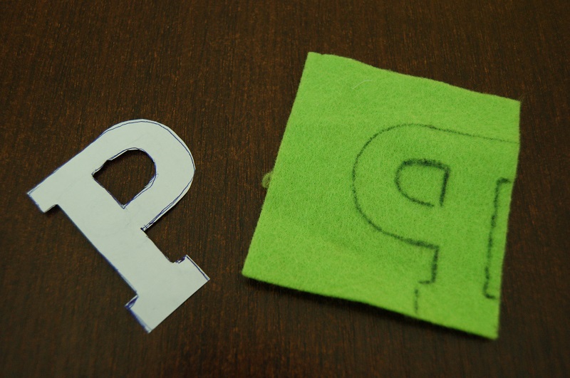 Padło na ozdobę w postaci inicjału właściciela. Najpierw na kartce papieru przygotowałyśmy szablon i odrysowałyśmy na filcu.
