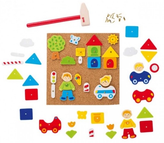 Kolejna propozycja dla małych majsterkowiczów to przybijanki. Zestaw składa się z tablicy korkowej, drewnianych elementów, pinezek i młotka. Dziecko może w dowolny sposób układać drewniane elementy na podstawce, a następnie używając młotka przybijać je. Aby nieco ułatwić tą czynność każdy element drewniany ma przygotowany otwór (bez tego przebicie go byłoby niebezpieczne i trudne). Również podstawka z korka powoduje, że dziecku nie jest trudno przybić element. Najważniejsze zaś, że dziecko operuje młotkiem i gwózdkami, jak dosrosły. Do wyboru jest wiele modeli tak, aby można było układać to co dziecko lubi farmę, więś, miasto, pojazdy, roboty czy wzory geometryczne.I co najważniejsza każda z opisanych zabawek wspiera rozwój motoryki dziecka oraz kreatywność i zainteresowanie inżynierią.